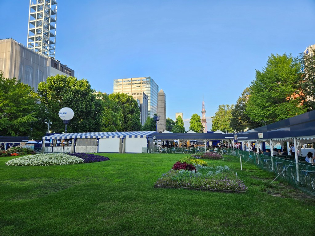 酒店check-in之后,我们迫不及待下楼逛大通公园。因为提着行李从火车站去酒店的路上就看到大通公园里面有夏天特属的Sapporo Beer Garden。于是我们也想喝一杯体验一下。