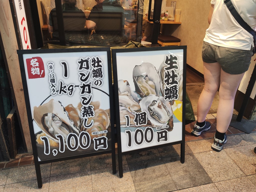 来到北海道,我们当然要吃海鲜啦!狸小路上有一家店门口的生蚝广告很吸引我们!1100yen 一个dozen!!!简直不要太便宜!