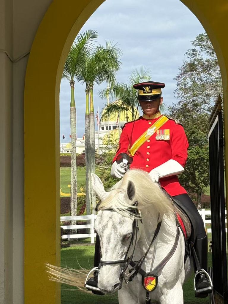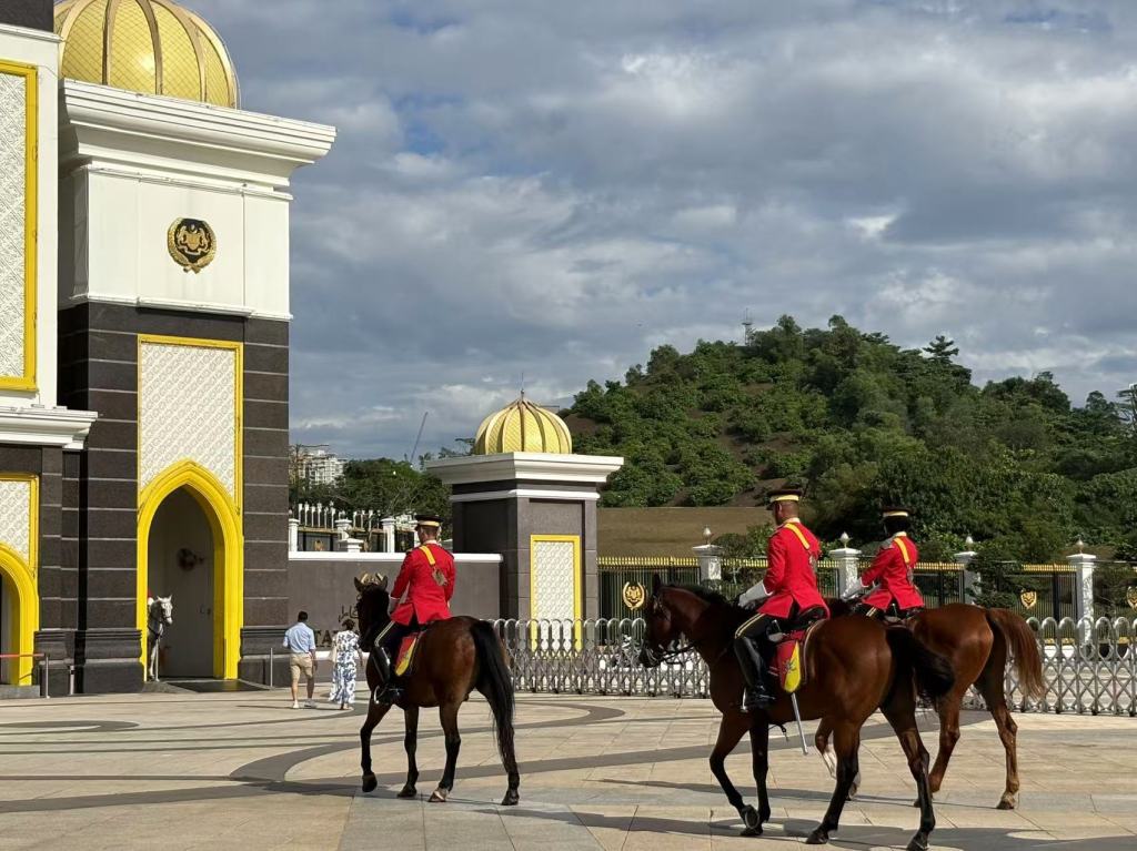第一站,国家皇宫(Istana Negara)。这座宫殿是马来西亚国王的官邸,金顶闪闪发光,门口的皇家卫兵笔挺地站着,偶尔变换站姿。换岗仪式带着浓浓的英式风格,整齐划一的步伐、黑色军靴踏在地面上发出的清脆声响,让人恍惚间有种身处白金汉宫的错觉。